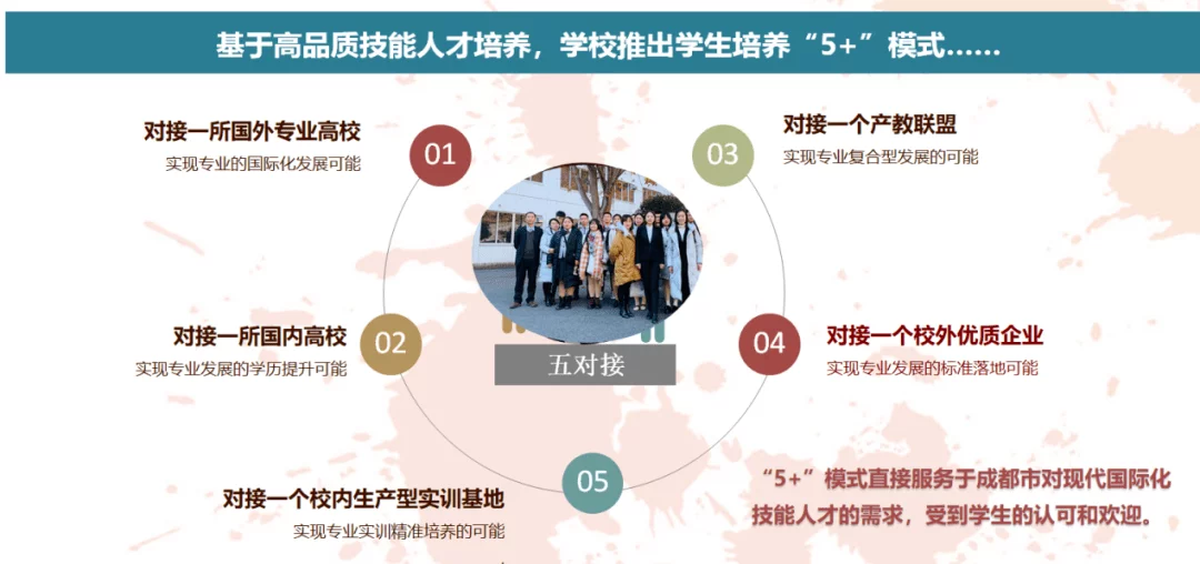 张涛介绍,学校教育实行5+模式,即任何一个专业、教师、学生都要实现学习工作中的五个对接,以学生为例,每个在校学生都要对接一所国内优质高校、一所国外优质高校、一个产教联盟、一个校内生产基地、一个国内优质企业,这五大模块学生都可以去尝试锻炼,找到适合自己的发展路径。