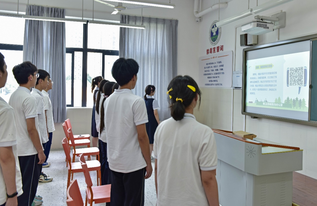 最后学生会主席李冰冰带领同学们集体宣誓:珍爱生命,远离毒品!坚定的声音表达了现代学子拒绝毒品的态度和决心。