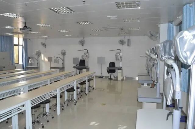 校内建有4个眼视光技术实训室,总面积360平方米,设备先进,总值120万余,专业核心课程全部实行理实一体化教学。