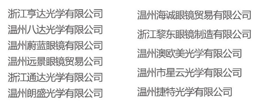 合作企业有浙江黎东光学眼镜有限公司、浙江亨达光学有限公司、温州瓯海眼镜厂、福建诚意眼镜有限公司、温州八达眼镜有限公司、温州市冠豪眼镜有限公司、浙江国际贸易有限公司等,杨思眼镜(上海)有限公司等。