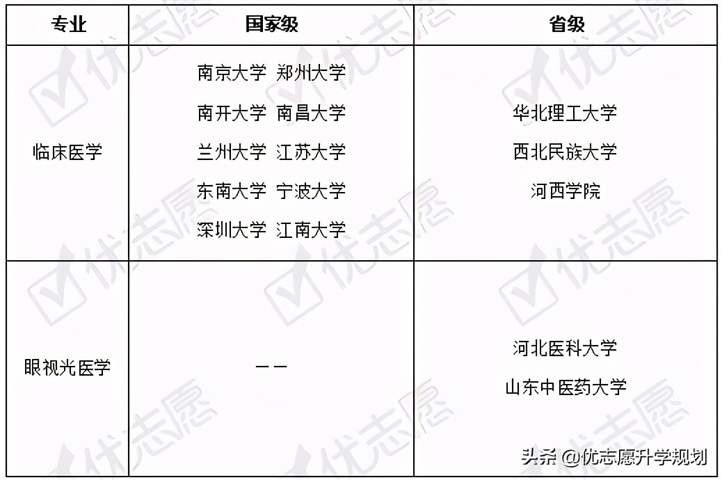 2019年4月教育部发布通知,决定启动一流本科专业建设双万计划,2019年至2021年建设1万个左右国家级一流本科专业点和1万个左右省级一流本科专业点。下表为建设临床医学和眼视光医学一流本科专业的部分院校,考生在报考时可关注该校本科专业的建设情况。