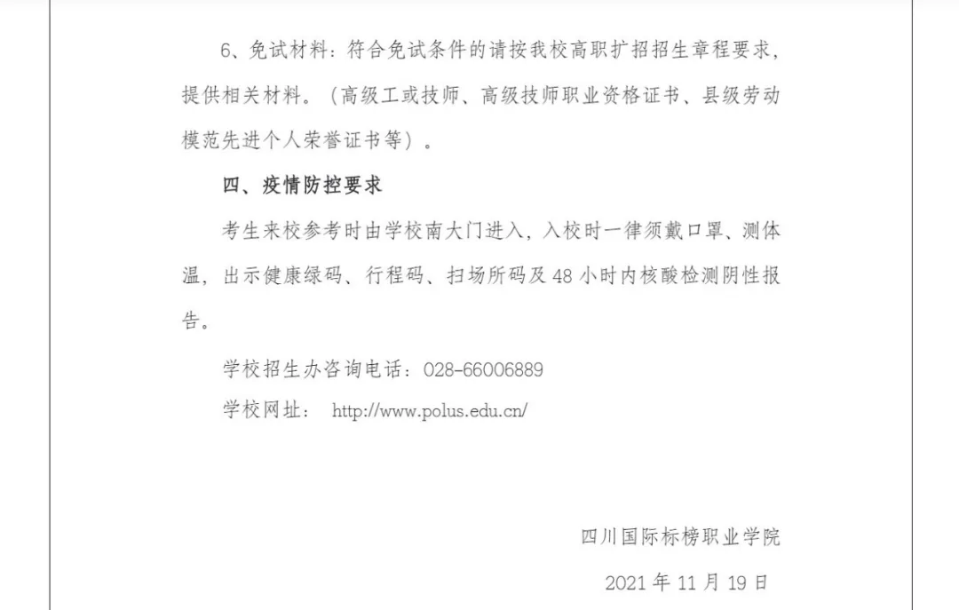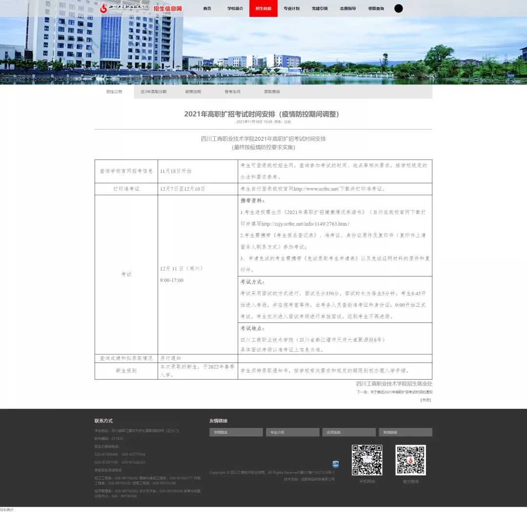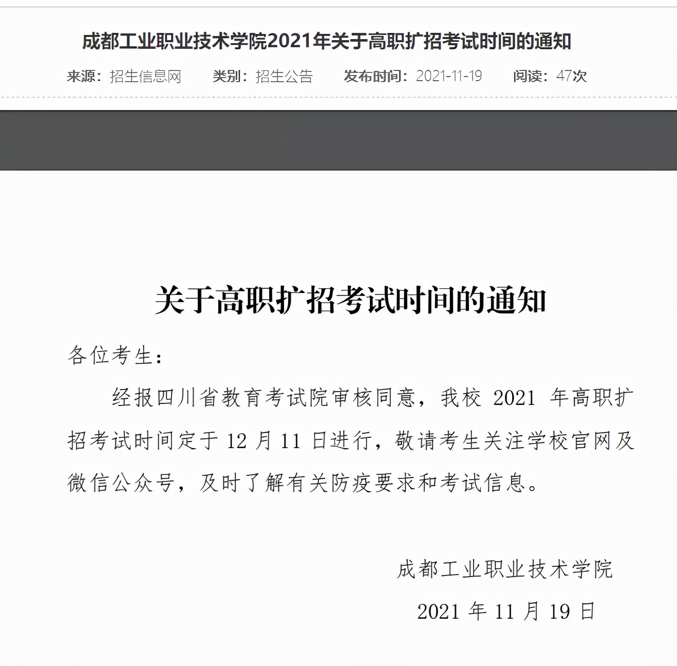 经报四川省教育考试院审核同意,我校 2021 年高职扩 招考试时间定于 12 月 11 日进行,敬请考生关注学校官网及 微信公众号,及时了解有关防疫要求和考试信息。