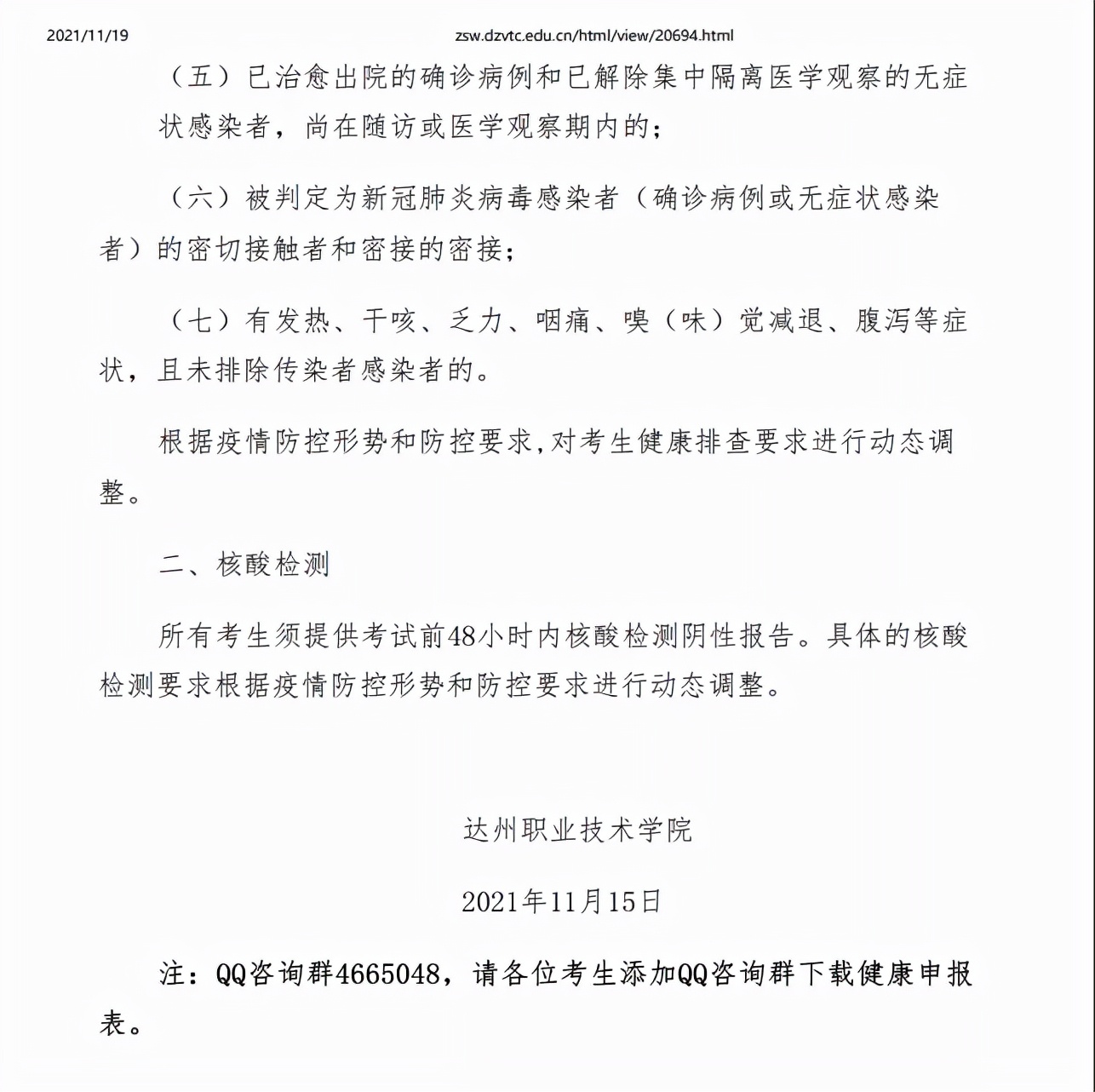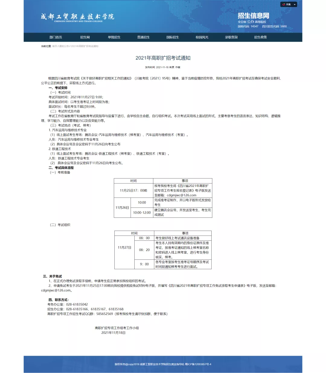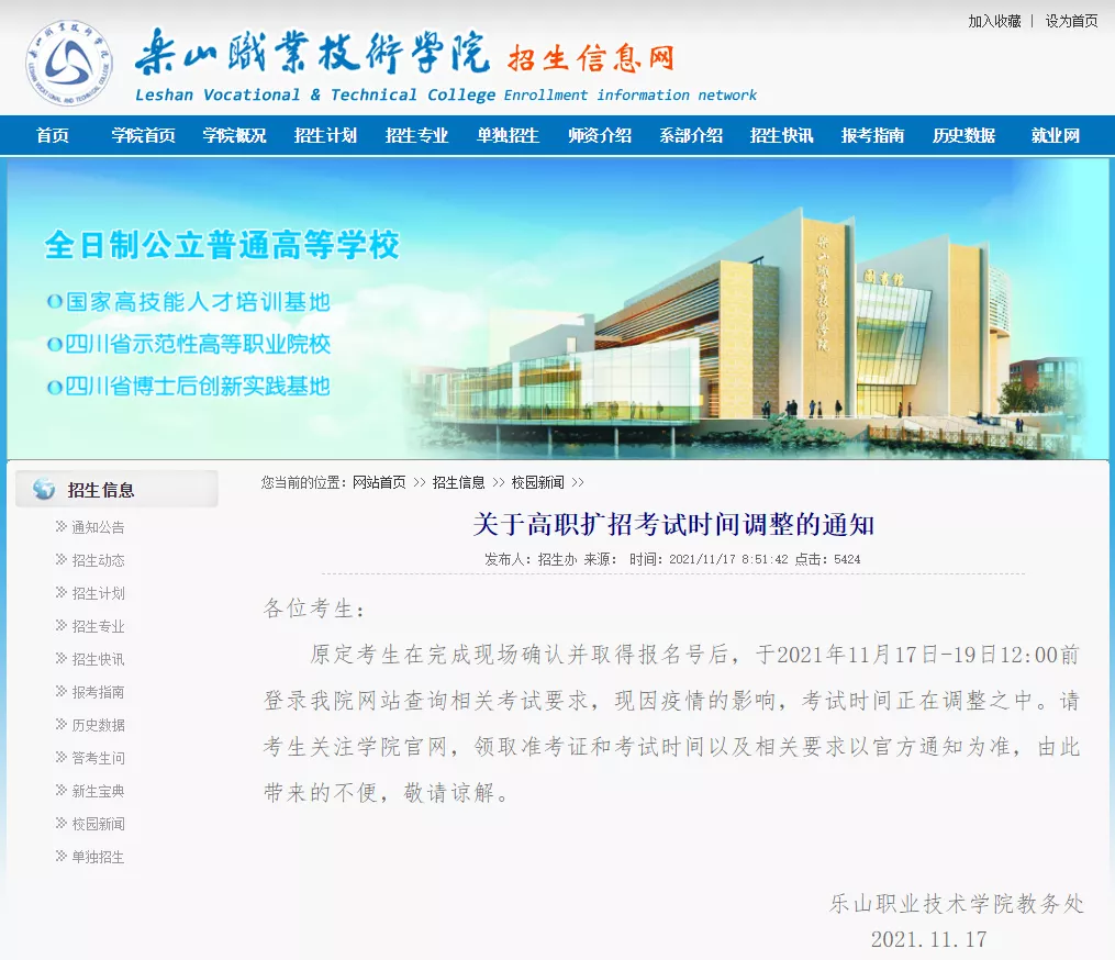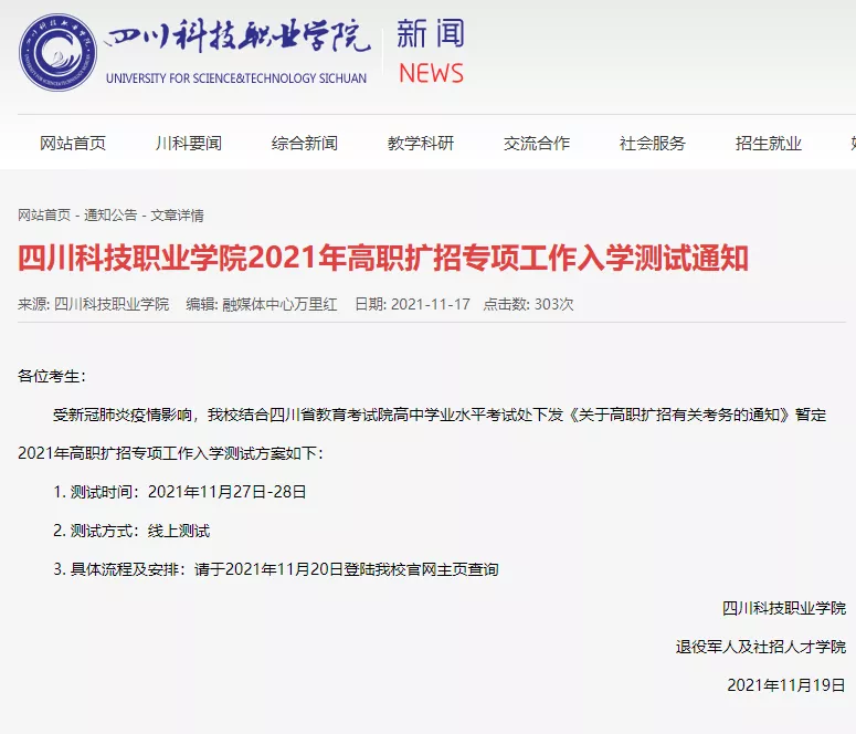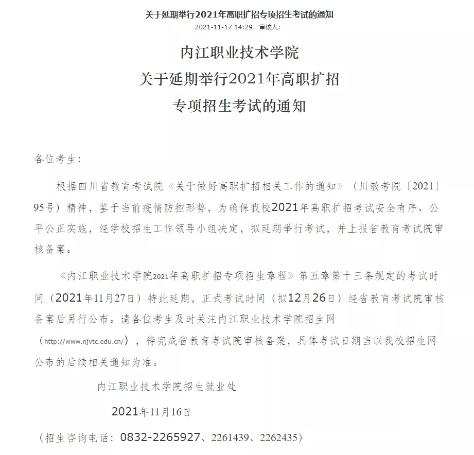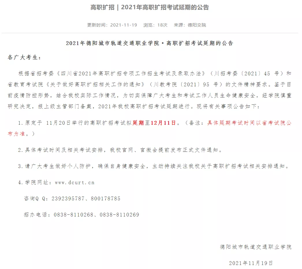 原定于11月20日在我校举行的高职扩招考试延期至12月11日。(备注:具体延期考试时间以四川省考试院公布为准。)