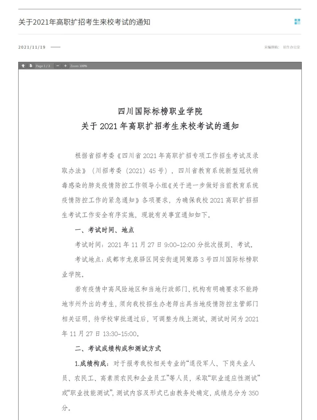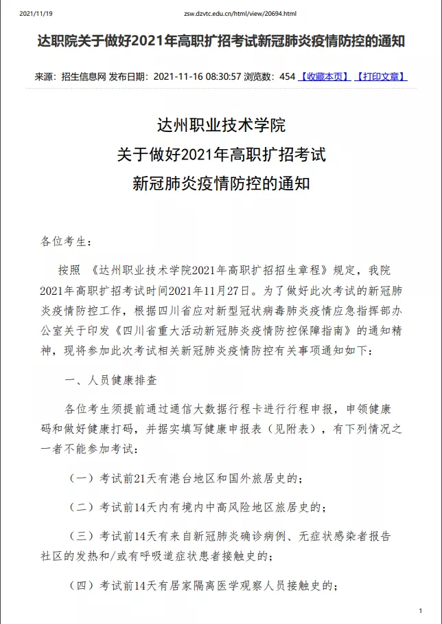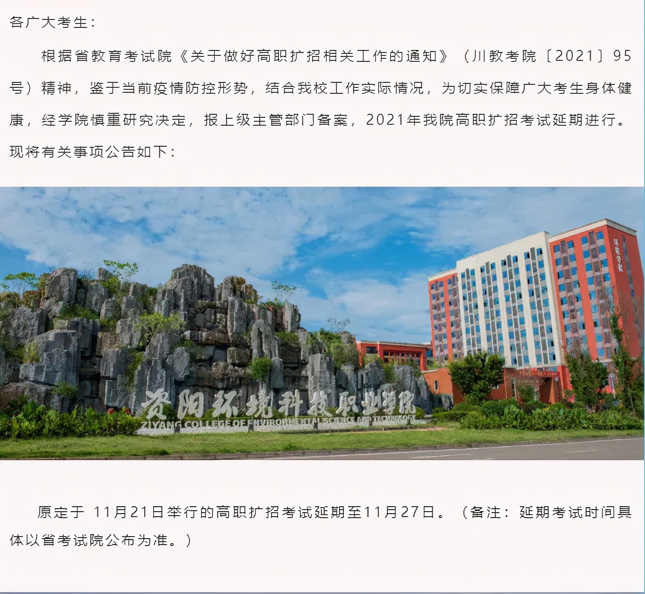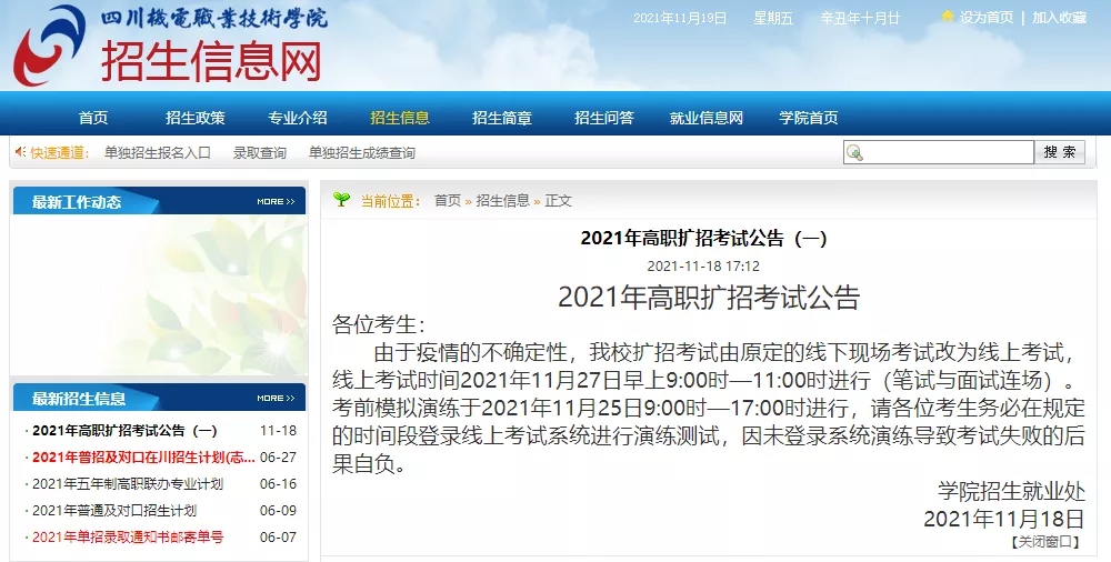 原定于11月21日举行的高职扩招考试延期至11月27日。(备注:延期考试时间具体以省考试院公布为准。)