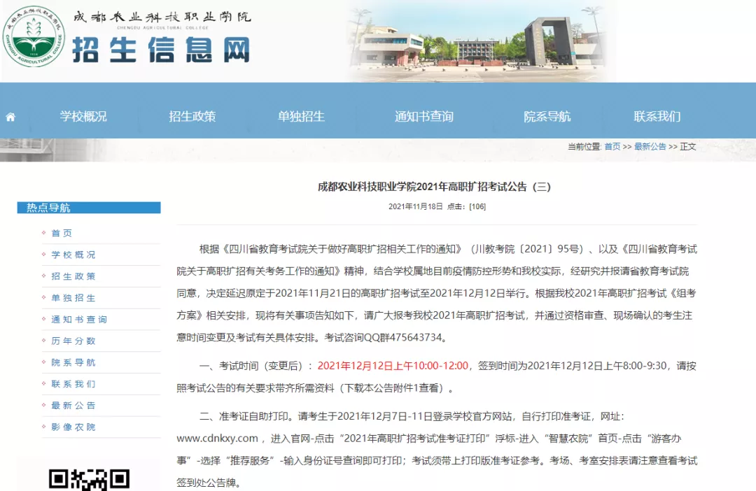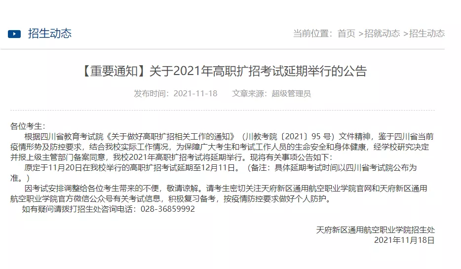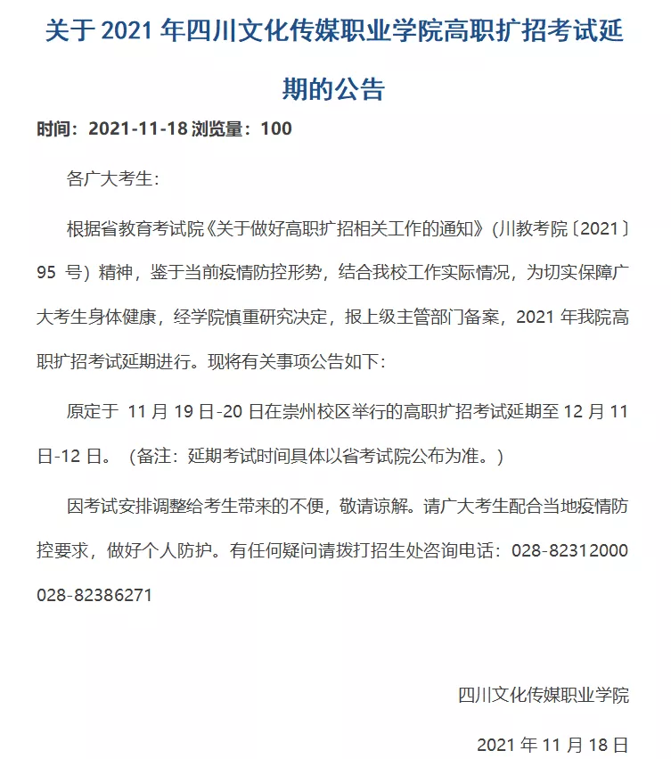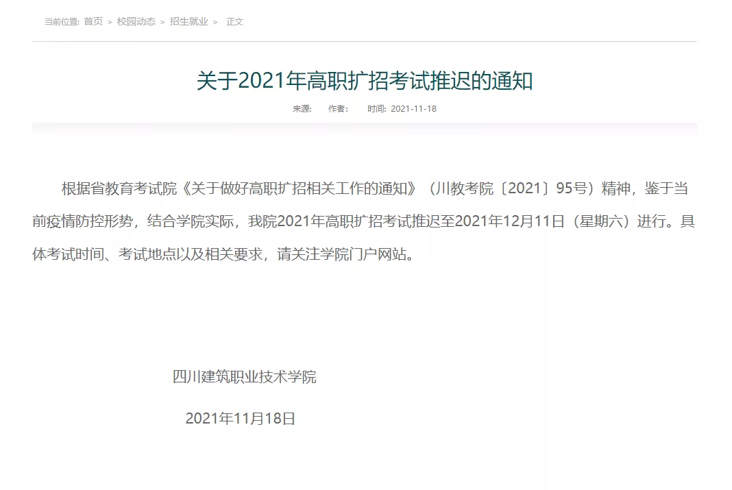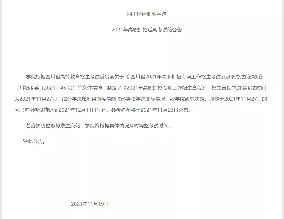 原定于 11月19日-20日在崇州校区举行的高职扩招考试延期至12月11日-12日。(备注:延期考试时间具体以省考试院公布为准。)