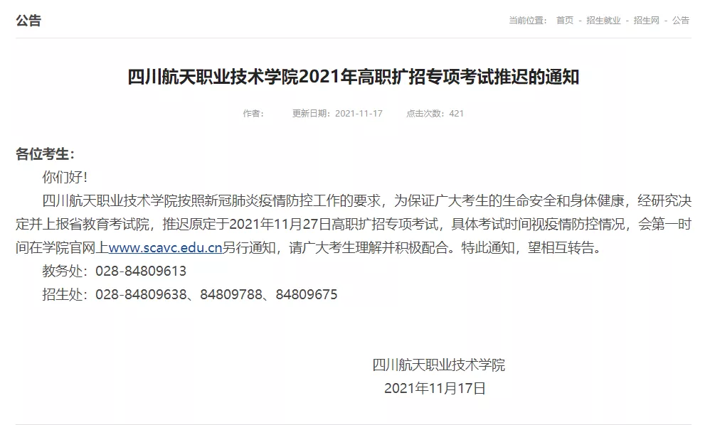 四川航天职业技术学校按照新冠肺炎疫情防控工作的要求,为保证广大考生的生命安全和身体健康,经研究决定并上报省教育考试院,推迟原定于2021年11月27日高职扩招专项考试,具体考试时间视疫情防控情况,会第一时间在学校官网上www.scavc.edu.cn另行通知,请广大考生理解并积极配合。