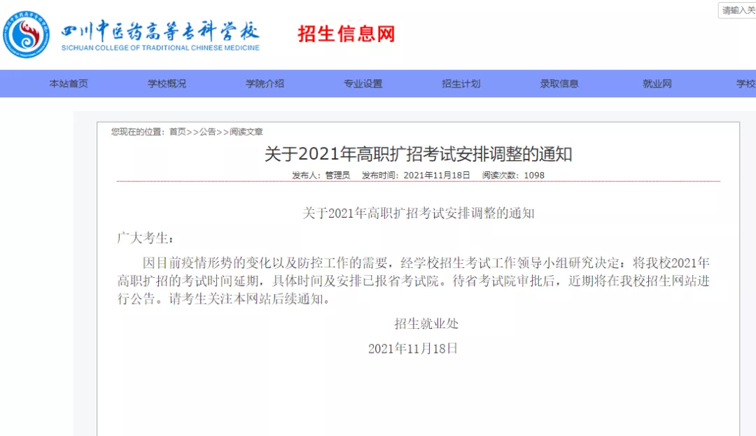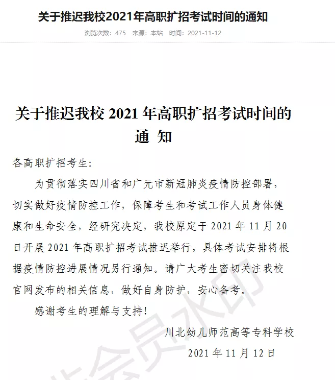 因目前疫情形势的变化以及防控工作的需要,经学校招生考试工作领导小组研究决定:将我校2021年高职扩招的考试时间延期,具体时间及安排已报省考试院。