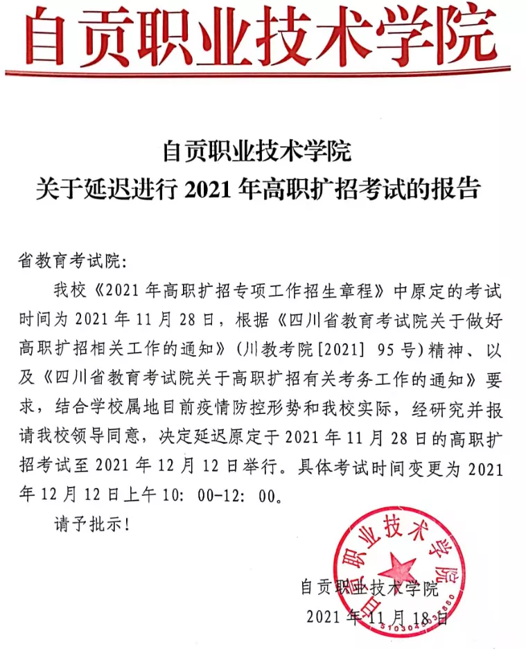 根据四川省教育考试院《关于做好高职扩招相关工作的通知》(川教考院〔2021〕95号)精神,鉴于当前疫情防控形势,为确保我校2021年高职扩招考试安全有序、公平公正实施,经学校招生工作领导小组决定,拟延期举行考试,并上报省教育考试院审核备案。