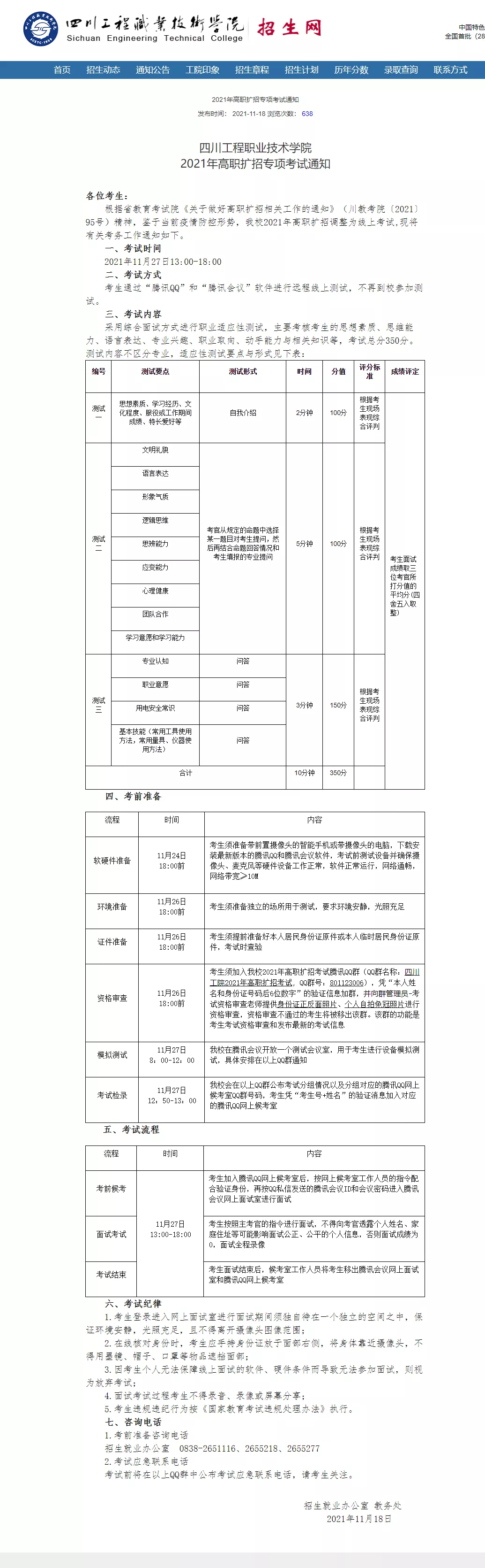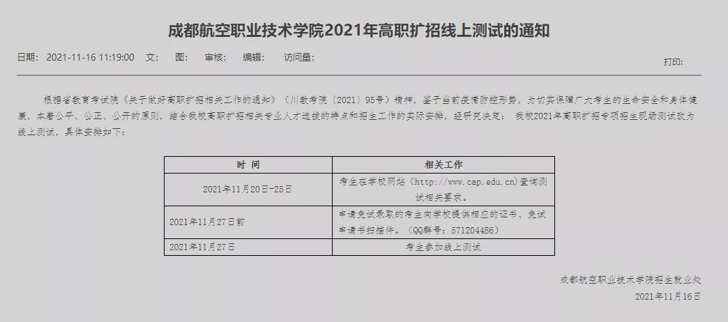 结合我校高职扩招相关专业人才选拔的特点和招生工作的实际安排,经研究决定:我校2021年高职扩招专项招生现场测试改为线上测试。