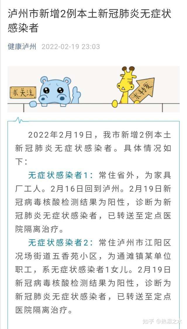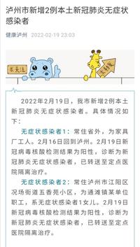 【四川泸州新增2例本土无症状感染者】2022年2月19日晚,封面新闻记者从泸州市卫生健康委员会官方公众号健康泸州获悉,泸州市新增2例本土新冠肺炎无症状感染者。具体情况如下:
