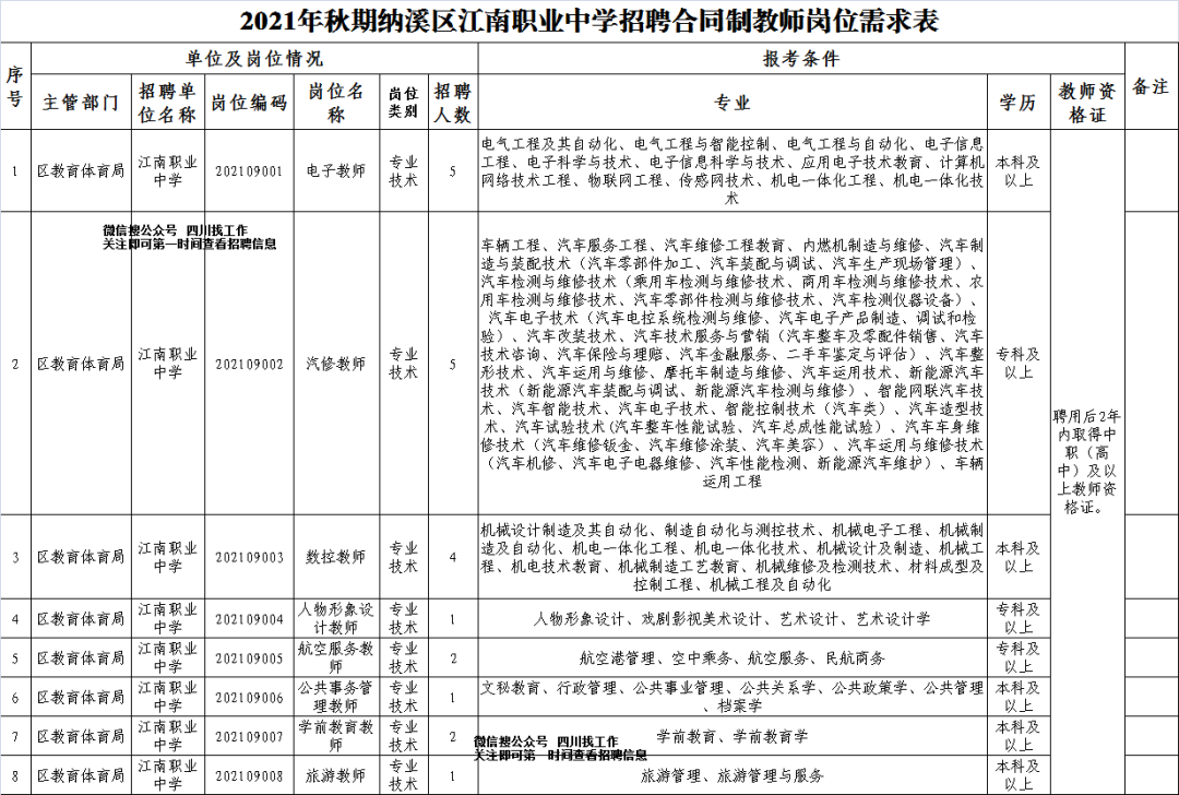 根据纳溪区江南职业中学教师队伍建设需要,按照公开、公平、竞争、择优的原则,面向社会招聘合同制教师21名。现将有关事项公告如下:
