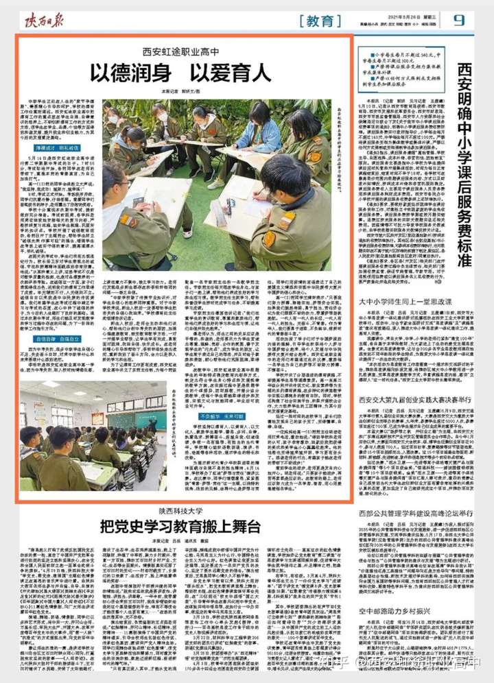 2021年5月23日中共陕西省委机关报《陕西日报》教育版三分之二版面再次大幅报道我校