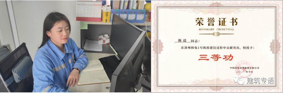 2019届毕业生陈晨,在中核五公司漳州核电项目部获得建设工程三等功。