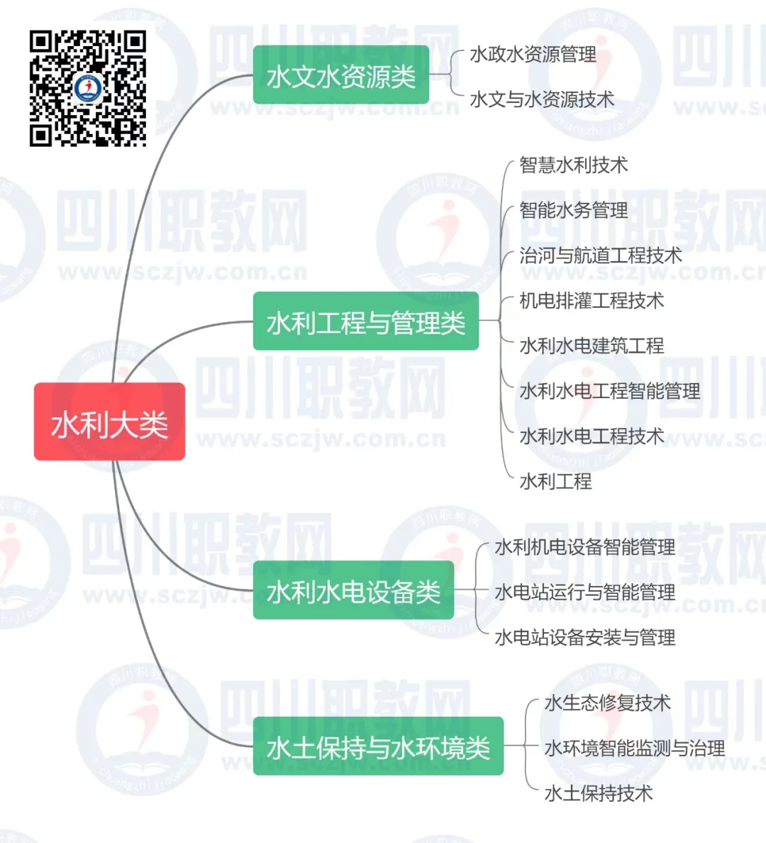本大类下共有水文水资源类、水利工程与管理类、水利水电设备类、水土保持与水环境类4个专业类。