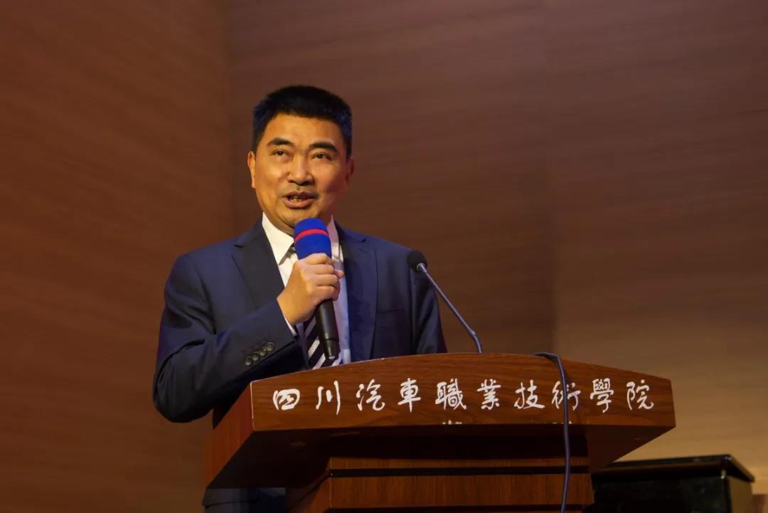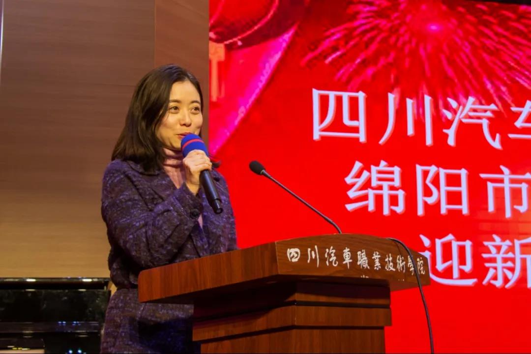 绵阳市涪城区文化馆馆长谢莉发表讲话。她代表涪城区文化馆全体成员向在座的领导及师生致以新春的美好祝福。谢馆长指出,四川汽车职业技术学校是一所办学特色鲜明的职业院校,培养了一大批高端职业技术人才。她谈到,涪城区文化馆历史悠久,作为国家一级文化馆,承担涪城区全民艺术普及培训、开展群众活动、非遗保护传承,文艺精品创作等工作,统筹管理64支群文艺术团队,取得了优秀的成绩。她希望校馆双方深入合作,将艺术馆文化融入校园文化,希望全体师生支持群文工作的发展,积极参与文化志愿活动,加入文化艺术的创新与繁荣行业之中。