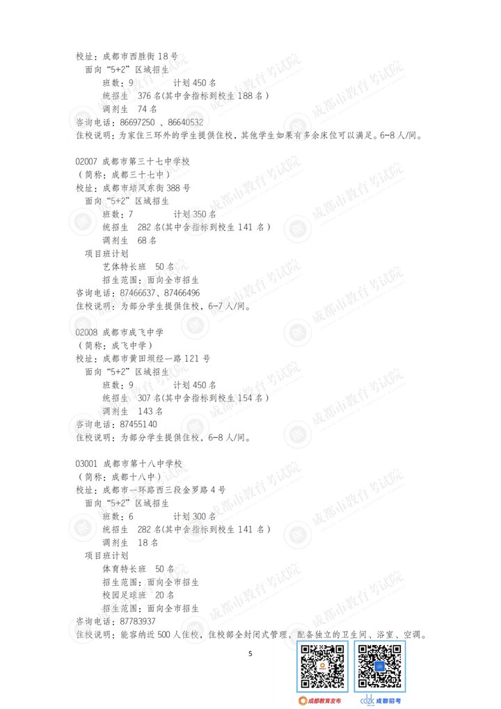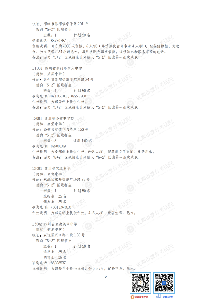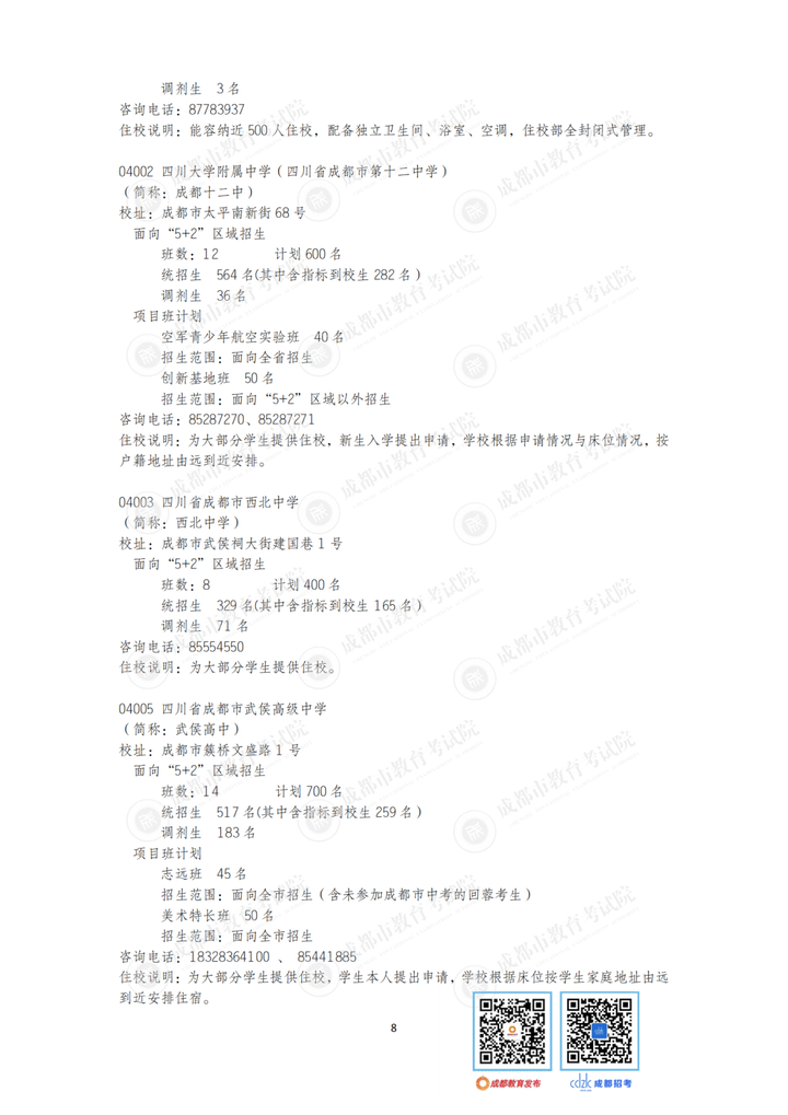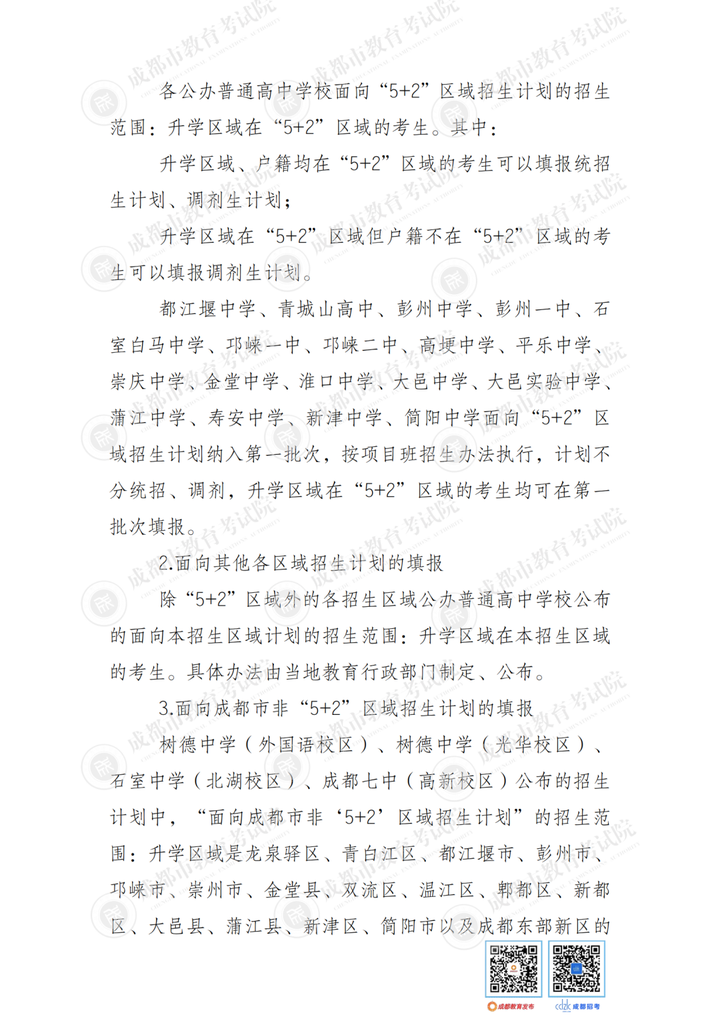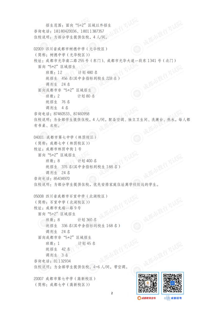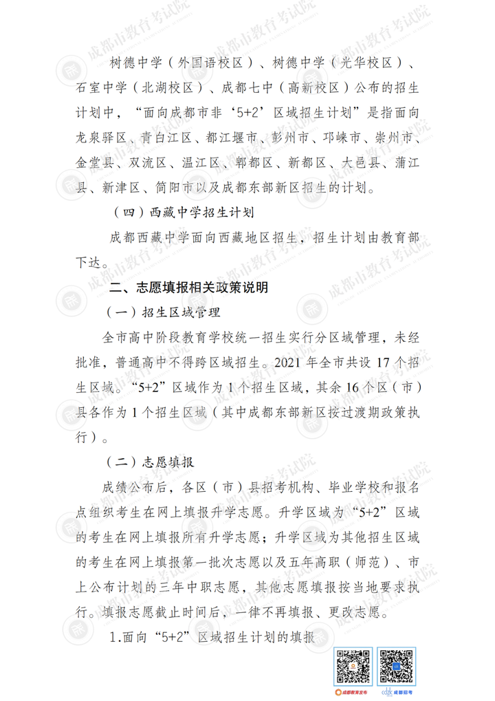 今年,石室中学、成都七中、树德中学等5+2区域的优质高中面向非5+2区域等招收42个班。成都市非5+2区域的优质高中面向5+2区域招收32个班1600人,较2020年增加6个班300人。郊区新城优质高中学校面向5+2区域招生的计划在第一批录取;龙泉驿区、青白江区、新都区、温江区、双流区和郫都区等6个区的优质高中学校面向5+2区域招生的计划在第二批和第四批录取。