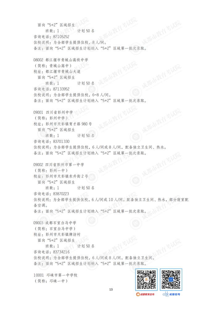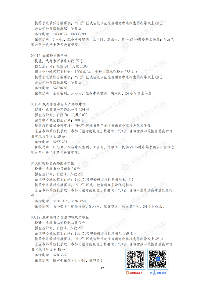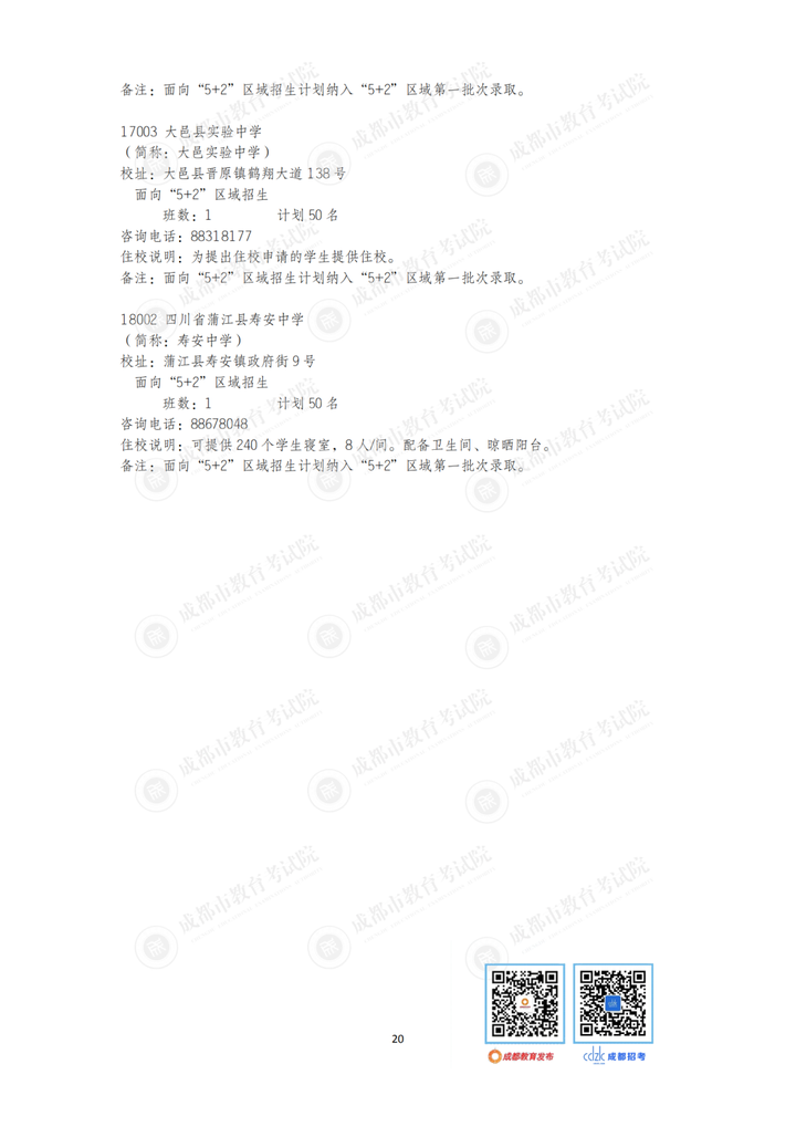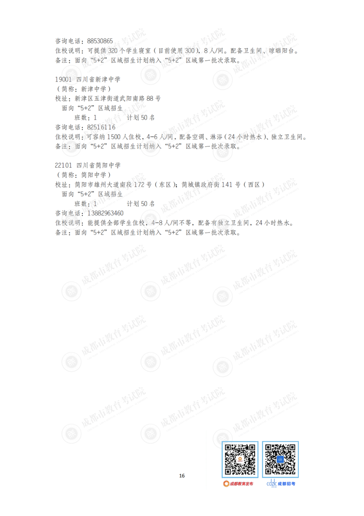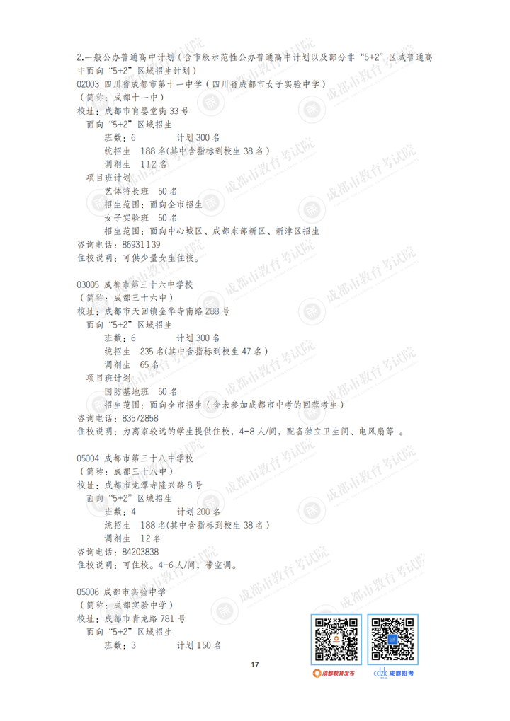 今年,石室中学、成都七中、树德中学等5+2区域的优质高中面向非5+2区域等招收42个班。成都市非5+2区域的优质高中面向5+2区域招收32个班1600人,较2020年增加6个班300人。郊区新城优质高中学校面向5+2区域招生的计划在第一批录取;龙泉驿区、青白江区、新都区、温江区、双流区和郫都区等6个区的优质高中学校面向5+2区域招生的计划在第二批和第四批录取。