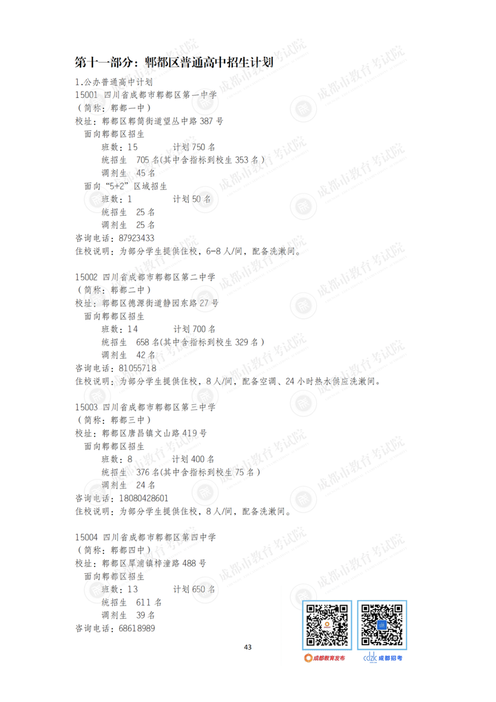 2021年全市中考报名人数13.15万人。按照教育部、四川省教育厅关于普职招生要求,结合成都实际,2021年全市普通高中招生计划为1670个班81228人,较2020年增加138个班,增招6468人。2021年全市普通高中招生计划为全市中考报名学生总数的62%,较2020年提高近2个百分点。