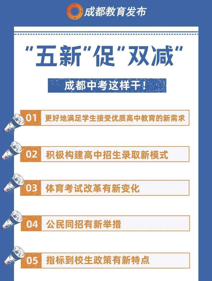 2021年7月,中共中央办公厅、国务院办公厅印发《关于进一步减轻义务教育阶段学生作业负担和校外培训负担的意见》,成都市作为全国9个试点城市之一,全面落实双减工作部署,已经取得初步成效。作为双减政策落地后的首次中考,市教育局将进一步优化完善中考招生政策,以五新促双减,回应家长、考生及学校的关切,有效缓解中考焦虑!