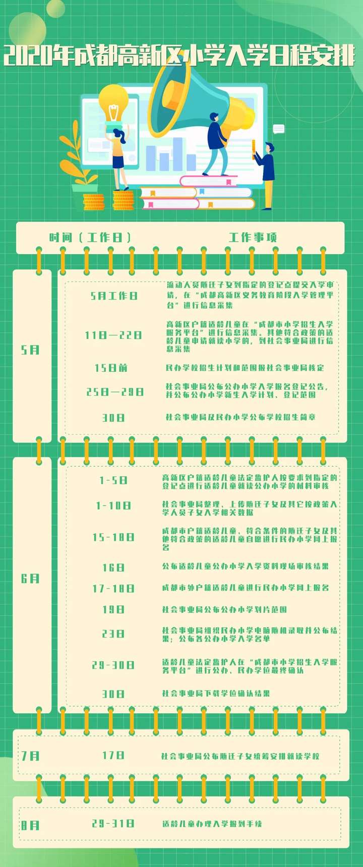 须在5月8日前向现就读小学提供户口簿和监护人房产证明,由现就读小学在毕业信息采集系统中上传材料,经社会事业局审查后,在成都高新区升学。