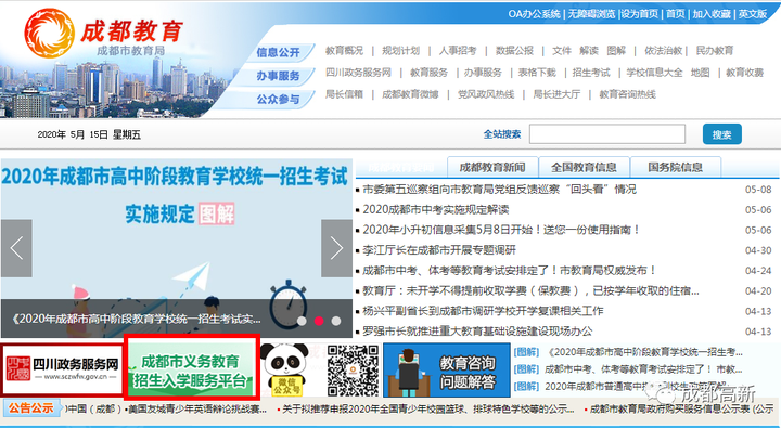 关注以下微信公众号或订阅号,点击相应菜单栏中的成都市义务教育招生入学服务平台进入成都市小学招生入学服务平台。