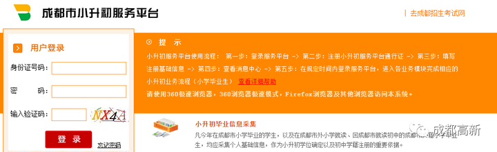 点击成都市义务教育招生入学服务平台进入成都市小学招生入学服务平台(请使用360极速浏览器,360浏览器极速模式,Firefox浏览器及其他浏览器)。