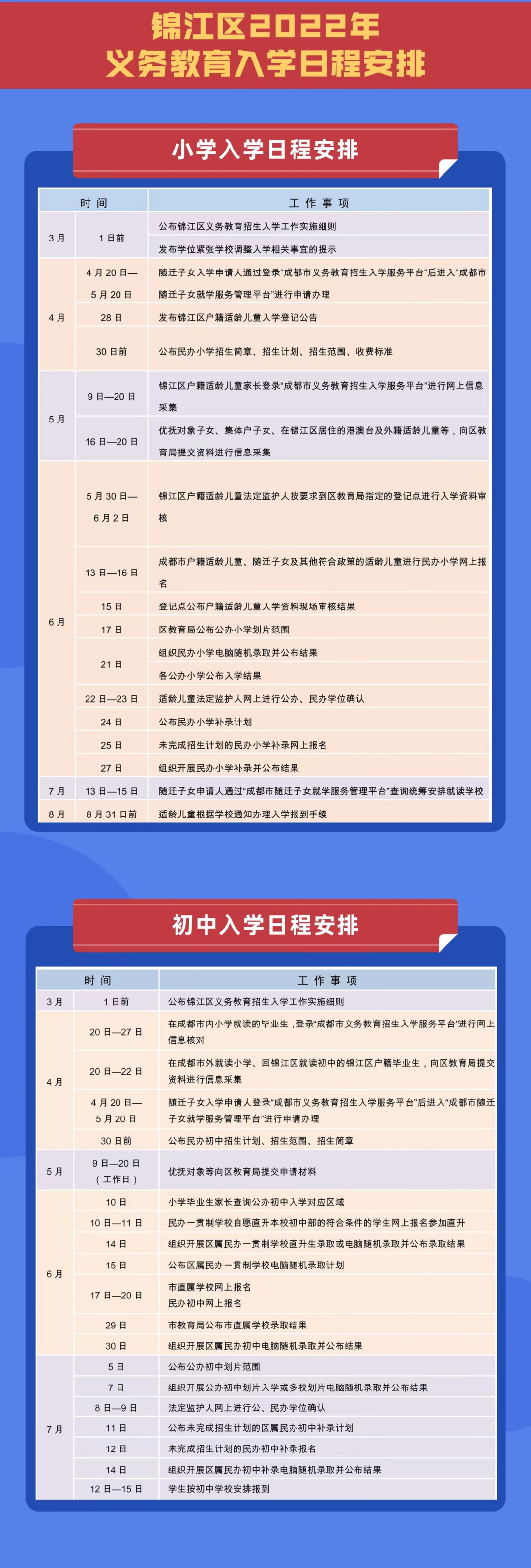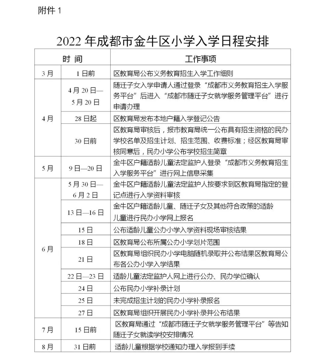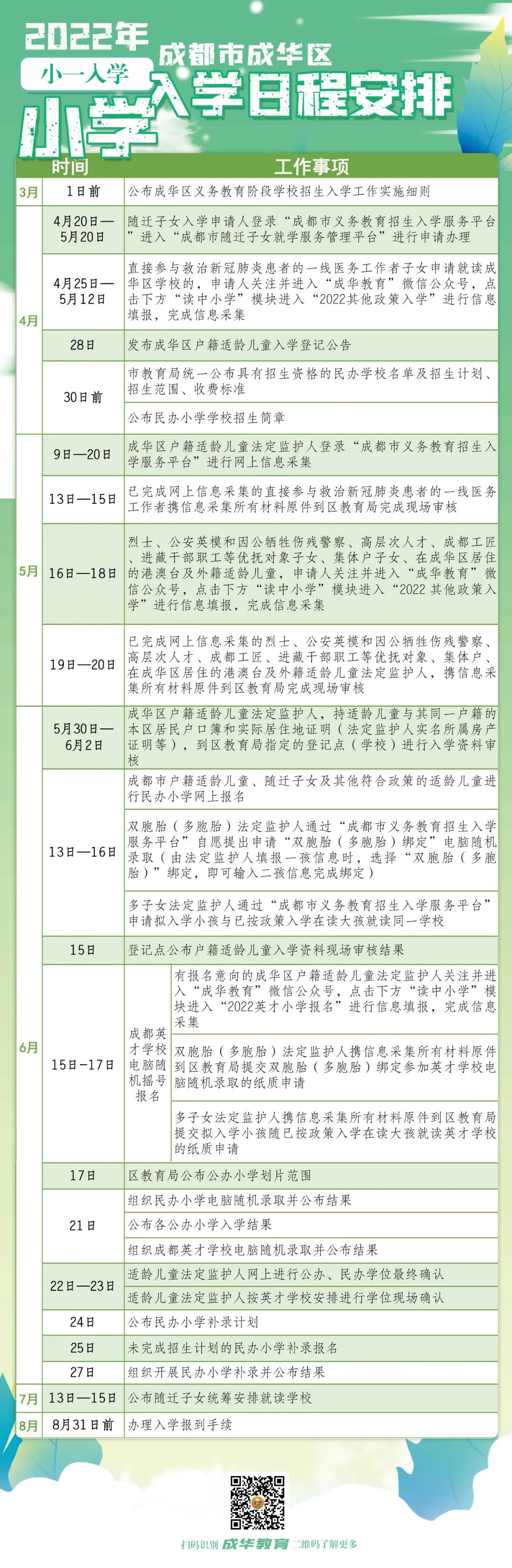1、4月28日发布本区户籍适龄儿童入学登记公告。户籍适龄儿童信息采集、报名均通过成都市义务教育招生入学服务平台进行。本区户籍适龄儿童法定监护人于5月9日—20日登录成都市义务教育招生入学服务平台,进入信息采集系统完成信息采集。