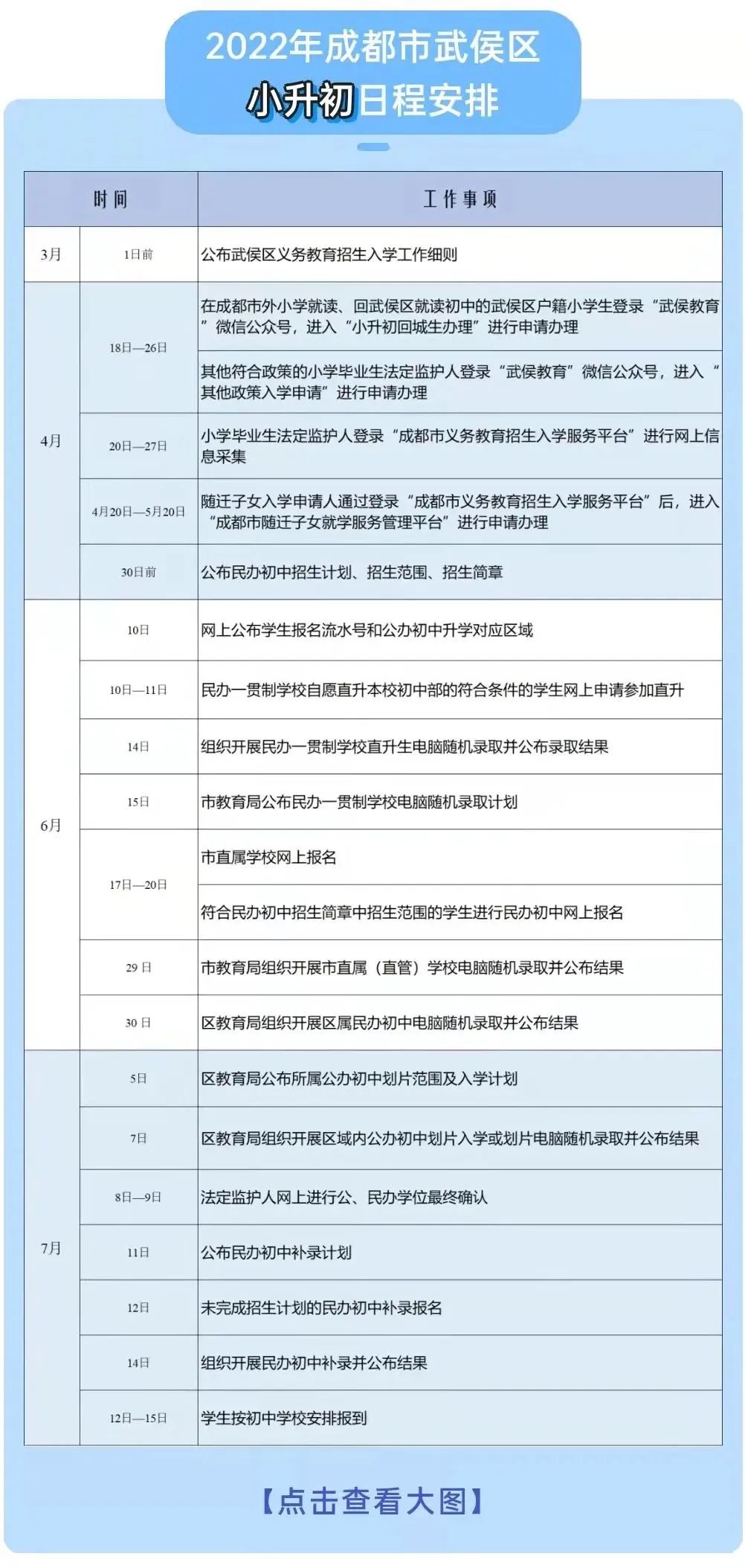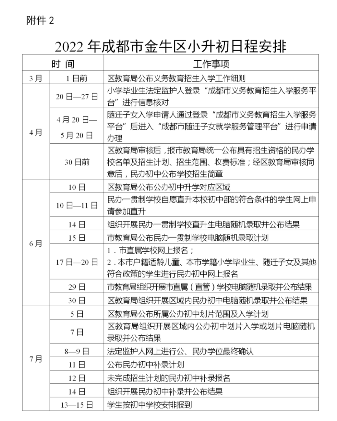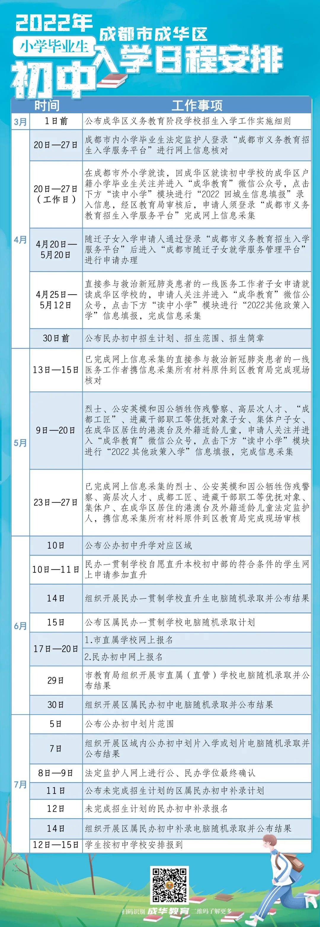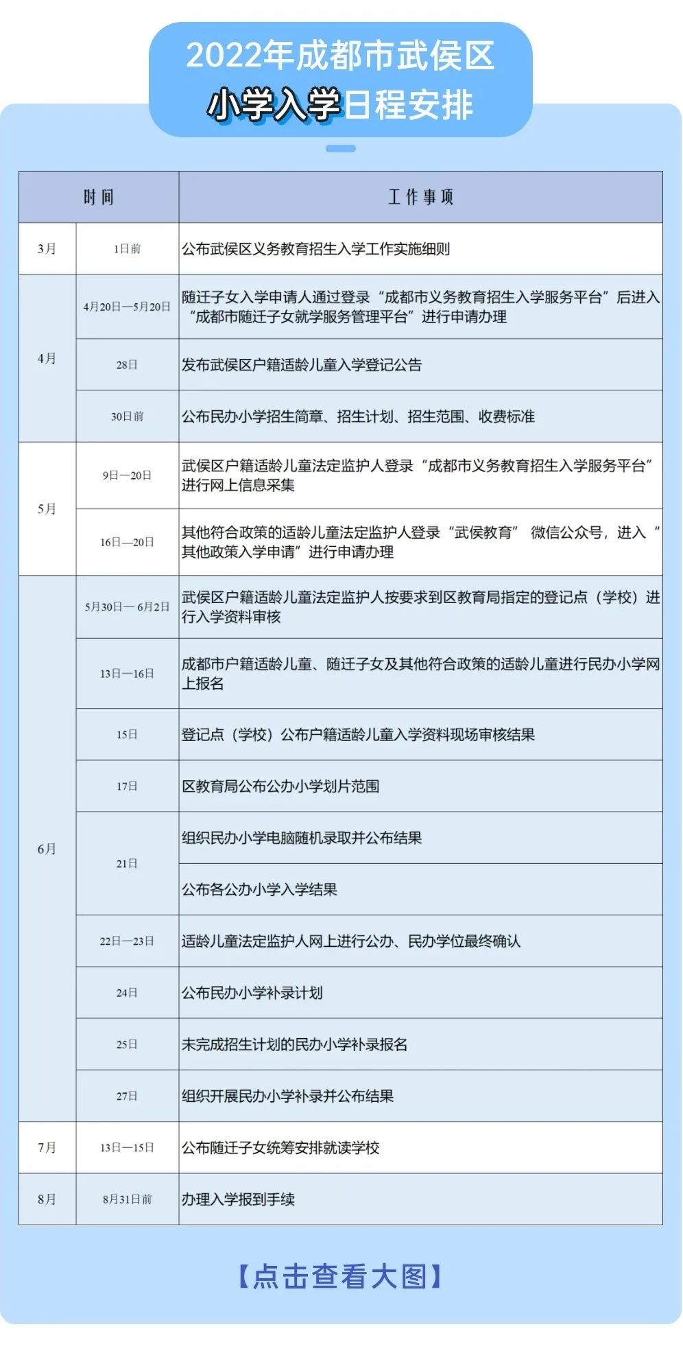1、4月28日发布本区户籍适龄儿童入学登记公告。户籍适龄儿童信息采集、报名均通过成都市义务教育招生入学服务平台进行。本区户籍适龄儿童法定监护人于5月9日—20日登录成都市义务教育招生入学服务平台,进入信息采集系统完成信息采集。