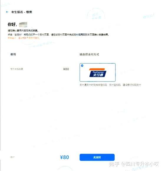 选好志愿、确认好自己的信息后,进入缴费界面。四川专升本考试费用为80元,支持扫码付款。