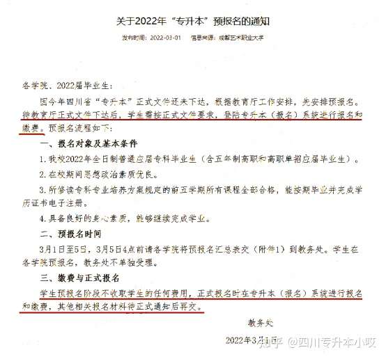 注意:1.不是所有学校都组织了预报名,通知了预报名的同学就按照学校要求报名,没通知的可以询问学校老师是否需要预报名。2.有部分学校规定没参加预报名的同学后续不能参加正式报名,所以学校通知了预报名的一定要记得报名!3.预报名不是最终报名,只是学校预先统计一下考生情况。后续同学们需要再次统一报名、缴费,不要觉得预报名了就是专升本报名完成了!成都艺术职业大学的专升本预报名通知中就有提到:待教育厅正式文件下达后,学生需按正式文件要求,登陆专升本(报名)系统进行报名和缴费。学生预报名阶段不收取学生的任何费用,正式报名时在专升本(报名)系统进行报名和缴费,其他相关报名材料待正式通知后再交。
