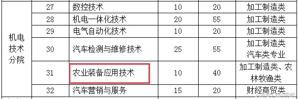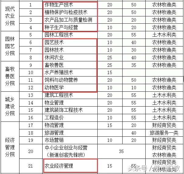 作物生产技术、植物保护与检疫技术、农产品加工与质量检测、种子生产与经营、园艺技术、园林技术、休闲农业、畜牧兽医、水产养殖技术、饲料与动物营养、动物医学、农业经济管理(学徒制班)、农业装备应用技术
