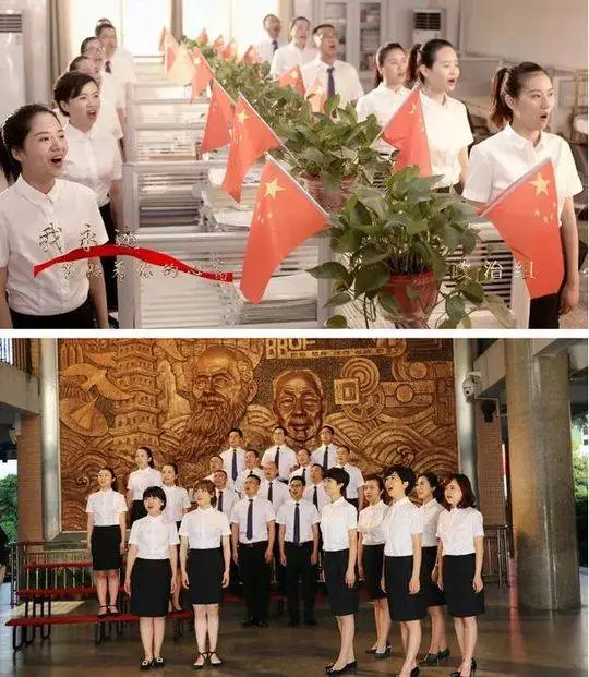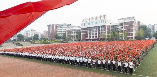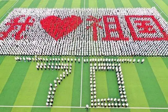9月15日,嘉陵江畔,白塔山下,白塔中学万名师生同唱一首《我和我的祖国》: 白中的运动场里/正汇集着几千朵美丽的小浪花/手举花环/铺成了一个巨幅屏幕/变幻出炫目的文字与图案/五星红旗/祖国万岁。