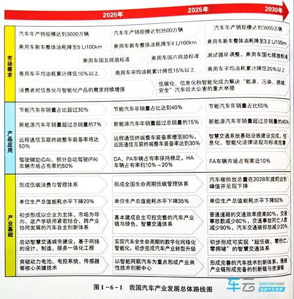 本文中,总路线图以2020年、2025年、2030年为节点,介绍了市场需求、产品应用以及产业基础。其中节能汽车、纯电动和插电式混合动力汽车、氢燃料电池汽车、智能网联汽车是我国汽车产业发展转型中的重点产品。路线图就上述重点产品,分别制定了产品路线图和支撑重点产品发展的技术路线图。车云菌将核心内容整理如下。
