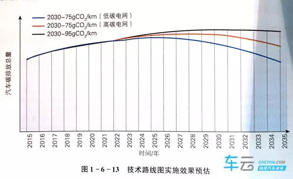 如果2030年按本次路线图提出的75g/km、新能源汽车占销量40%以上测算,我国汽车产业从油井到车轮的CO2排放总量将从2028年就开始呈现下降趋势,如果2025年前我国电网能实现从高碳电网向低碳电网的转型,汽车产业从油井到车轮的CO2排放总量将在2026年之后就开始明显下降。
