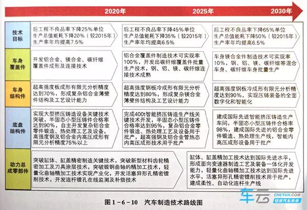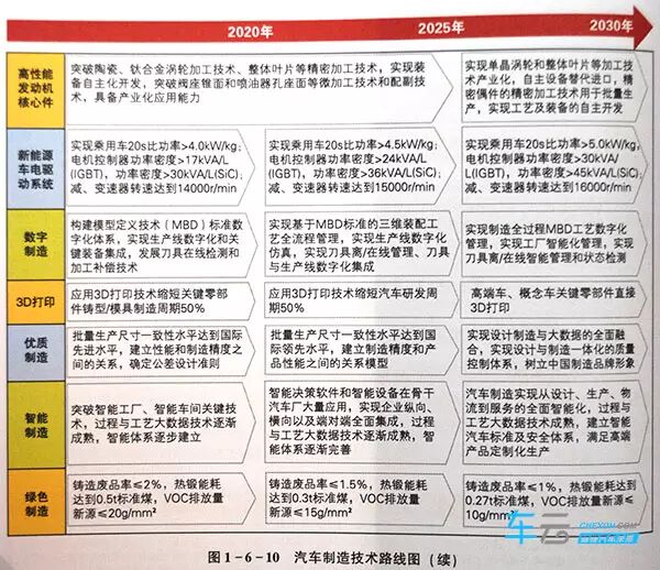 汽车制造技术路线图以绿色制造,智能制造,优质制造,快速制造为发展主线,全面提质增效降耗,以铝镁合金和碳纤维复合材料为重点,逐步掌握轻量化材料制造技术,以动力总成及新能源汽车电驱动系统为突破口,显著提升轴、齿等零部件的加工制造技术,实现制造装备的数字化、智能化。