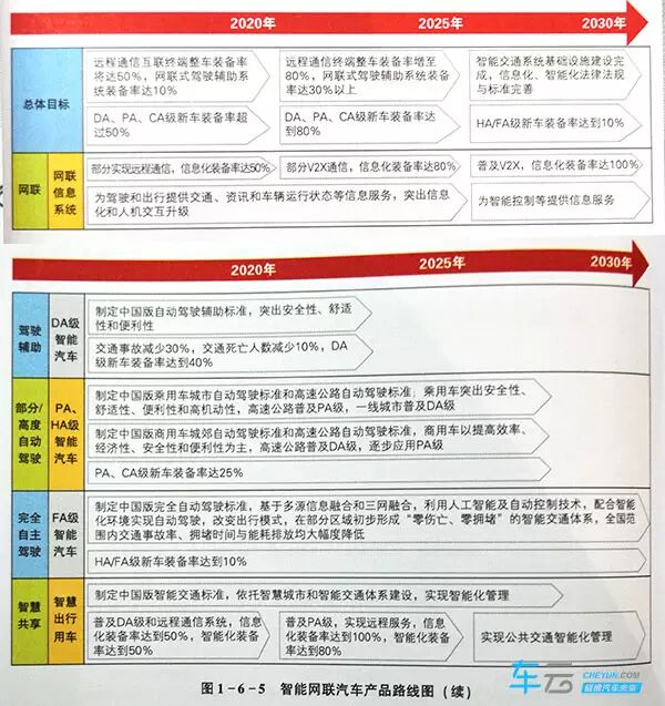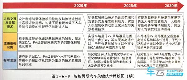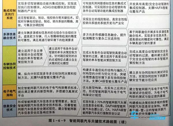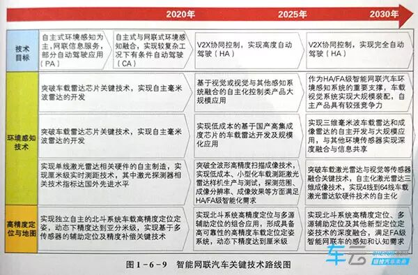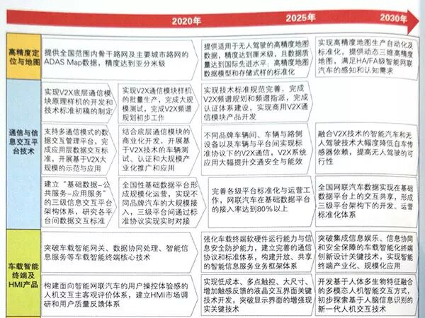 基于自主环境感知的单项驾驶辅助功能(DA),大规模运用将于2016年实现,以自主环境感知为主,网联信息服务为辅的部分自动驾驶(PA)应用将于2018年实现,融合自车传感器和网联信息,可在复杂工况下的半自动驾驶(CA)将于2020年实现,在2025年以后可实现V2X协同控制,完成高度/完全自动驾驶功能(HA/FA),在2030年左右实现一定规模的产业化应用。