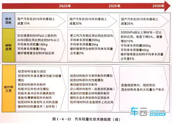 2026年-2030年为第三阶段,重点发展镁合金和碳纤维复合材料技术,解决镁合金及复合材料循环再利用问题,实现碳纤维复合材料混合车身及碳纤维零部件的大范围应用,突破复杂零件成型技术和异种零件连接技术。