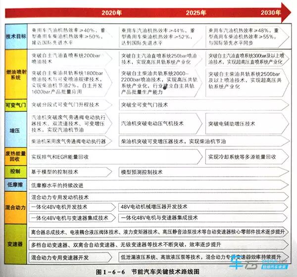 节能汽车技术路线重点在于采用高效燃烧,降低摩擦,先进控制等技术提高发动机热效率,以多挡化和高效化提高传动效率,采用混合动力技术进一步降低整车油耗。