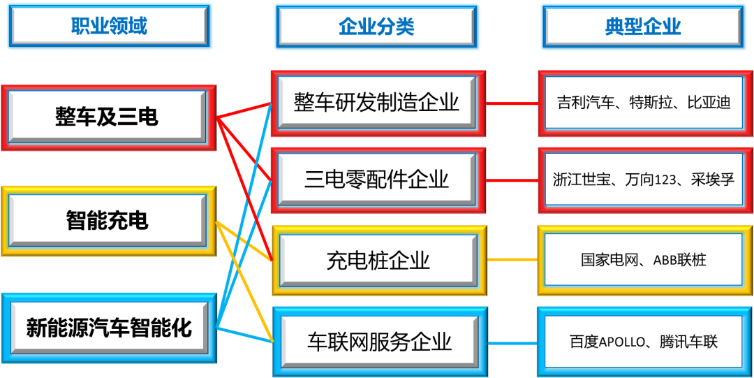 在新能源汽车整车企业从事整车的装配、调试、质量检测工作,在新能源汽车关键零部件生产企业从事产品助理研发、性能测试以及售后技术服务等工作,在质量检验部门从事新能源汽车电子产品检测、性能鉴定、可靠性试验等技术工作。