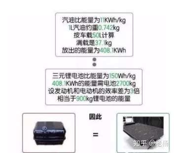 能量密度方面电池肯定不如汽油,但是究竟差别多大呢?一箱50L的汽油可以大概跑600km,续航同样里程的电动车需要多少电池呢?(如下图)