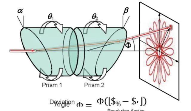 棱镜激光雷达的内部一般采用双楔形棱镜结构,其中激光在通过第个楔形棱镜后发生一次偏转,之后在通过第二个楔形棱镜后再一次发生偏转。只要控制两面棱镜的相对转速便可以控制激光束的扫描形态。