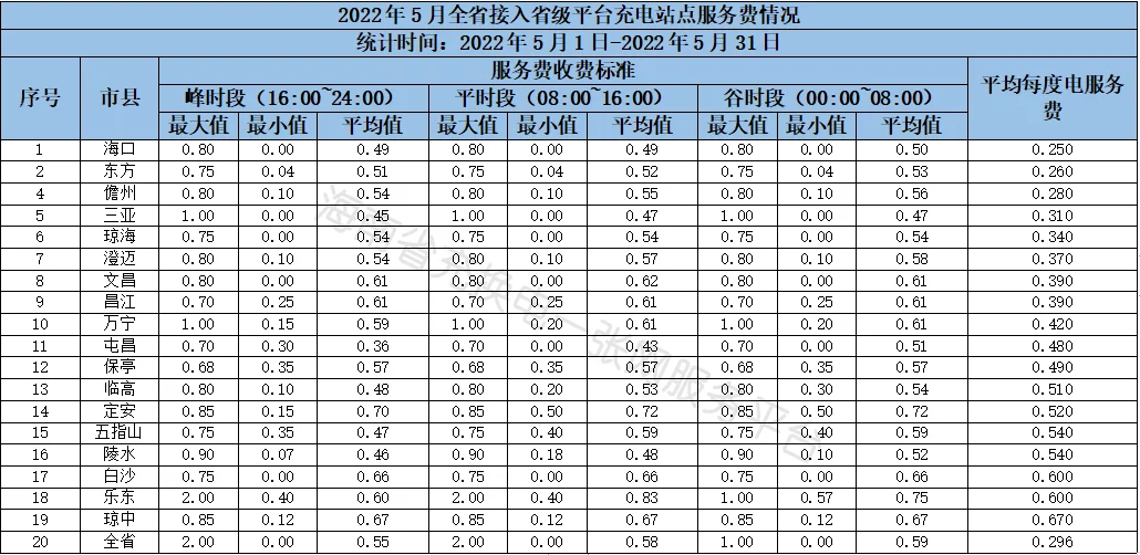 在充电服务费方面,今年5月,全省充电服务费的服务费标准(采集到各企业的收费标准值)峰时段平均值为0.55元,平时段服务费平均值为0.58元,谷时段平均值为0.59元。5月全省平均每度电服务费为0.296元(实际服务费和电量计算得出的实际值)。其中,琼中的平均每度电服务费最高,为0.67元每度电;最低的为海口,为0.25元每度电。低于全省平均值的有海口、东方、儋州3个市。
