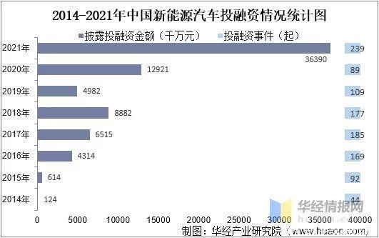 2021年我国新能源汽车投融资事件239起,披露投融资金额为3639亿元,同比增长181.6%,其中,宁德时代吸金能力最强,2021年披露融资总额超582亿元,完成一轮定向增发。比亚迪位居其后,披露融资总额超266亿元。我国新能源汽车投融资金额于2020年突破亿元大关,2021年突破3亿元。