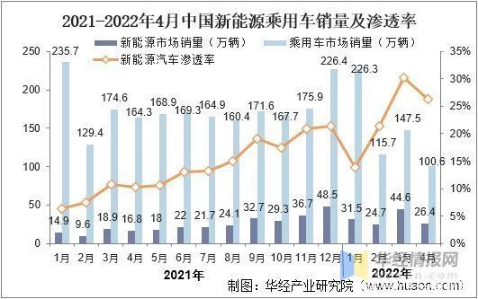 2021-2022年4月新能源乘用车销量及市场渗透率