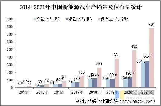 2014年以来,我国新能源汽车产销量稳定增长,2019年受补贴政策、市场需求等因素的影响稍有下降,整体保持上升趋势,2021年,我国新能源汽车产量为354.5万辆,销量为352.1万辆,产销量为99.3%,市场新能源汽车保有量为784万辆。