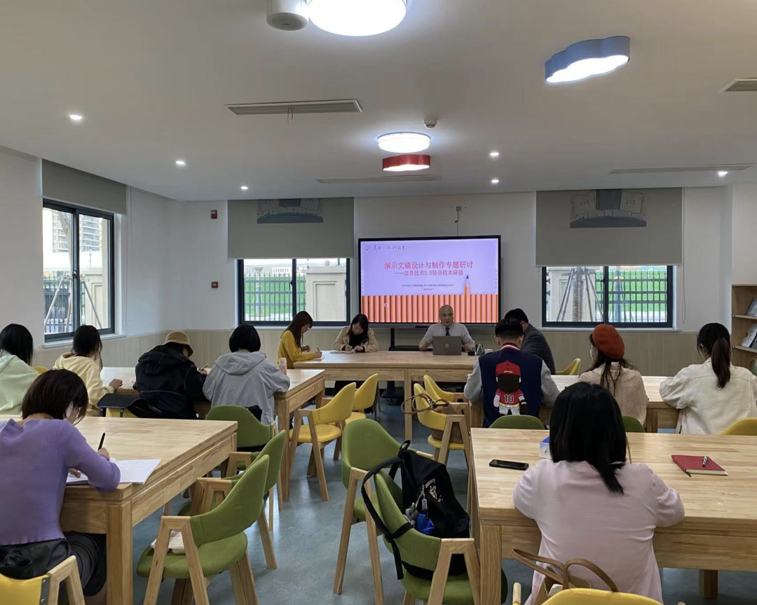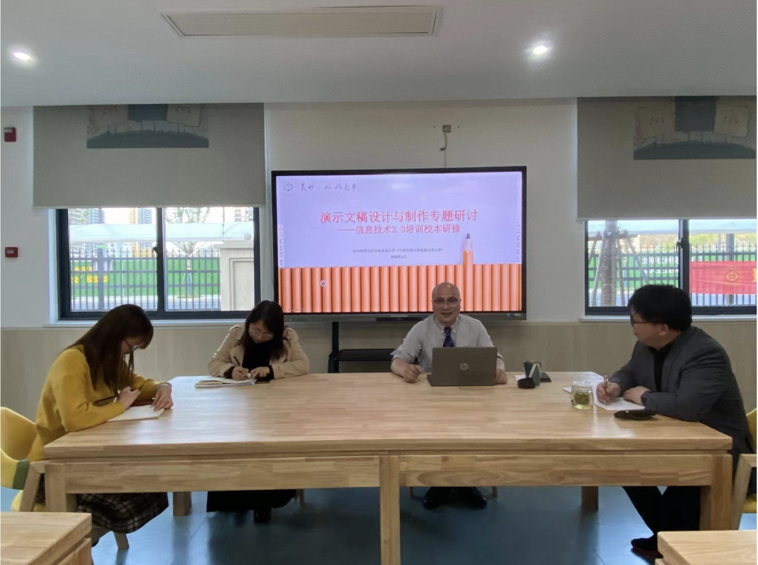 4月8日(周五)下午5点45分,中国传媒大学附属临安小学16名教师在学校图书馆开展信息技术提升校本研修活动,本次研修活动的主题是演示文稿设计与制作专题研讨。
