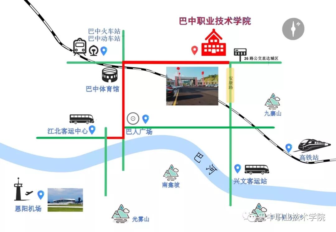 学校位于素有红色之乡,川东北氧吧之称的川东北红色革命老区—巴中市。东邻达州,南接南充,西抵广元,北接汉中,4C级民用运输机场巴中恩阳机场、动车、高速公路全线贯通,交通便利;