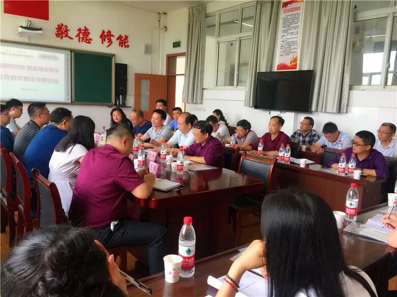 在座谈交流环节,高强校长代表峨眉山市职业技术学校对隆昌市城关职业中学的领导和老师们一行的到来表示热烈的欢迎,并对学校的基本情况及四川省中职示范学校的建设情况进行了介绍。隆昌城关职中的黄绍刚校长介绍了省示范校建设情况以及隆昌城关职中在师资队伍、课程开发、产教融合等方面的一些经验。峨眉山市教师培训中心室副主任陈强对本次交流活动进行了指导,希望两校通过本次交流,众筹提质,促进教学理念的更新、质量的提高。两所学校的各个对口科室和教研组还针对学校高三教学管理和诊改等工作进行了深度交流。