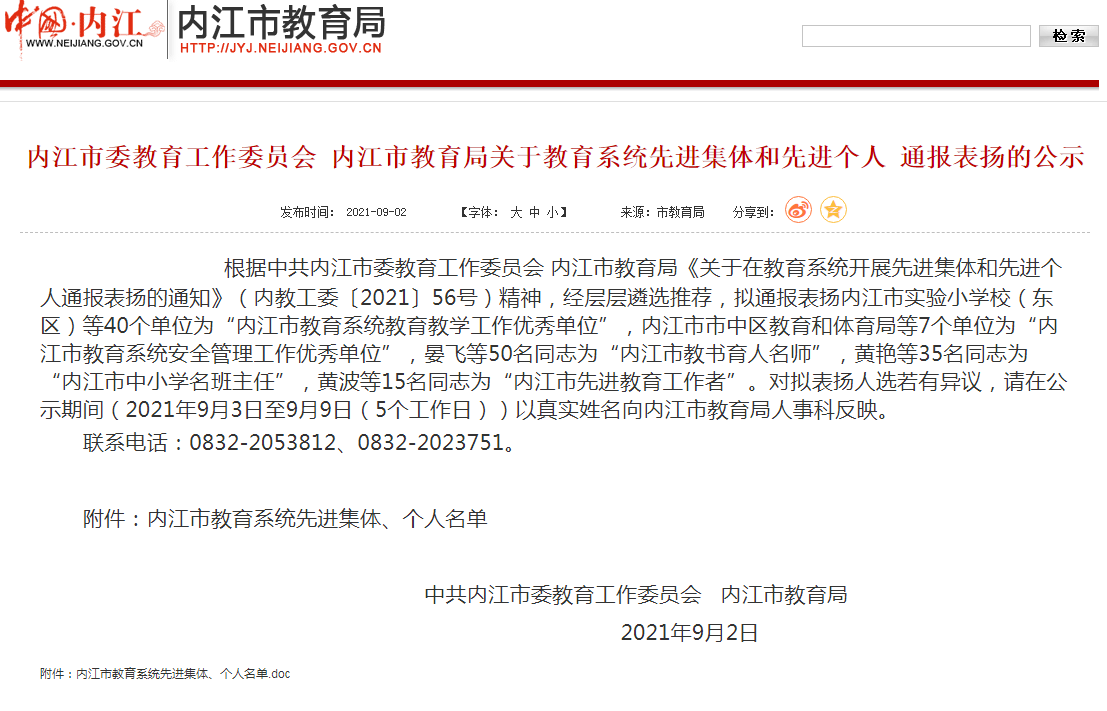 根据中共内江市委教育工作委员会 内江市教育局《关于在教育系统开展先进集体和先进个人通报表扬的通知》(内教工委〔2021〕56号)精神,经层层遴选推荐,拟通报表扬内江市实验小学校(东区)等40个单位为内江市教育系统教育教学工作优秀单位,内江市市中区教育和体育局等7个单位为内江市教育系统安全管理工作优秀单位,晏飞等50名同志为内江市教书育人名师,黄艳等35名同志为内江市中小学名班主任,黄波等15名同志为内江市先进教育工作者。对拟表扬人选若有异议,请在公示期间(2021年9月3日至9月9日(5个工作日)以真实姓名向内江市教育局人事科反映。