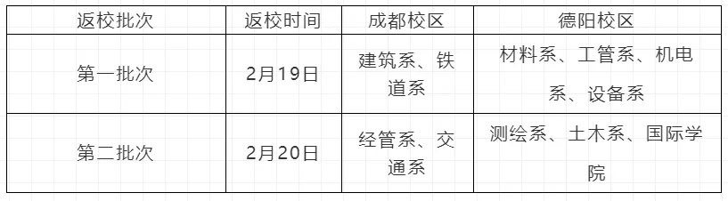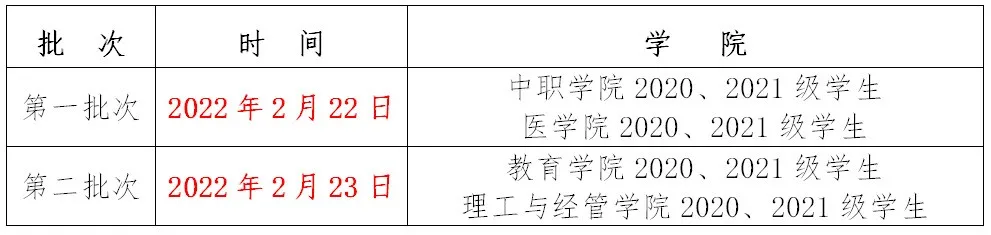 第一批(2022年2月25日):通信工程学校、士官学校非毕业班级符合返校条件的学生;第二批(2022 年 2月26日):信息工程学校、经济管理学校非毕业班级符合返校条件的学生;毕业班级学生自2022年2月25日起,确保在智慧门户中已完成人脸识别认证的,均可按一、二年级学生返校程序申请返校。四川航天职业技术学校